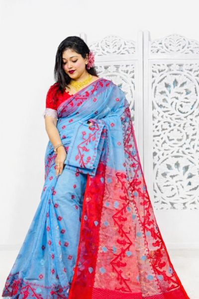 6 days, 16 hours agoProduct published : Blue Red Dhakai Jamdani Pure Handloom Cotton Saree From Bengal